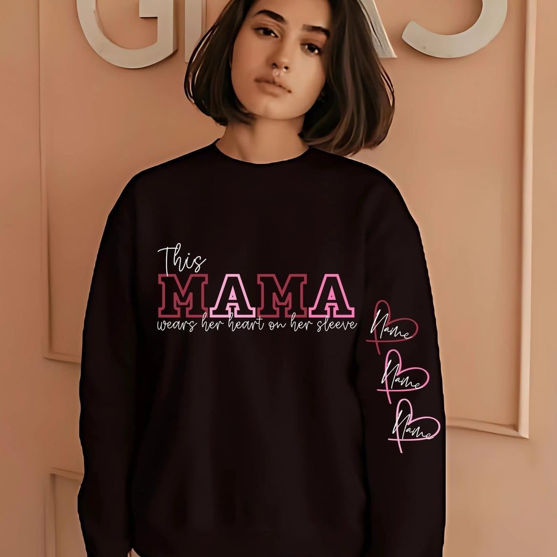 Nazenti Personalized This Mama Wears Her Heart on Her Sleeve Sweatshirts, Mama Valentine Sweatshirt, Mamas Sweaters for Women
