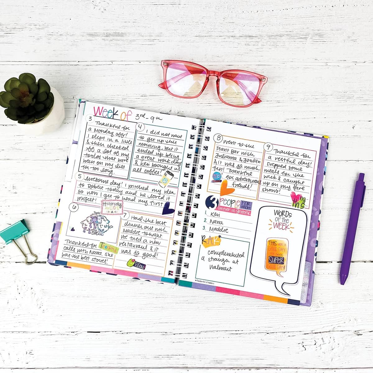 Questions, quotes and prompts to prime the pump for positivity throughout your journalPerpetual style layout so journal daily or as frequently as you wish. 52 weekly spreads with brilliantly colorful layoutsEach week has daily sections, three-lines for acknowledging good people or good experiences, “Words of the Week” quote bubble for jotting simple joys and a Random Act of Kindess (R.A.K.) section as a reminder even the littlest acts of kindness are kind of a big deal.It’s the perfect size to tuck in most handbags or backpacks so that it’s convenient to jot a thought when moment moves you.Laminated tabs and elastic enclosure to help you locate your current week easily165 hand-illustrated smile-provoking stickers to enhance any entryLots of bonus segmented quote bubbles that are just right size for a quick thought Water-resistant hardcover was designed to last a lifetime. Referring to it regularly is so powerful!Easily add photos, greeting cards, artwork using Pull & Place Strips (sold separately) to snap them into the coil.