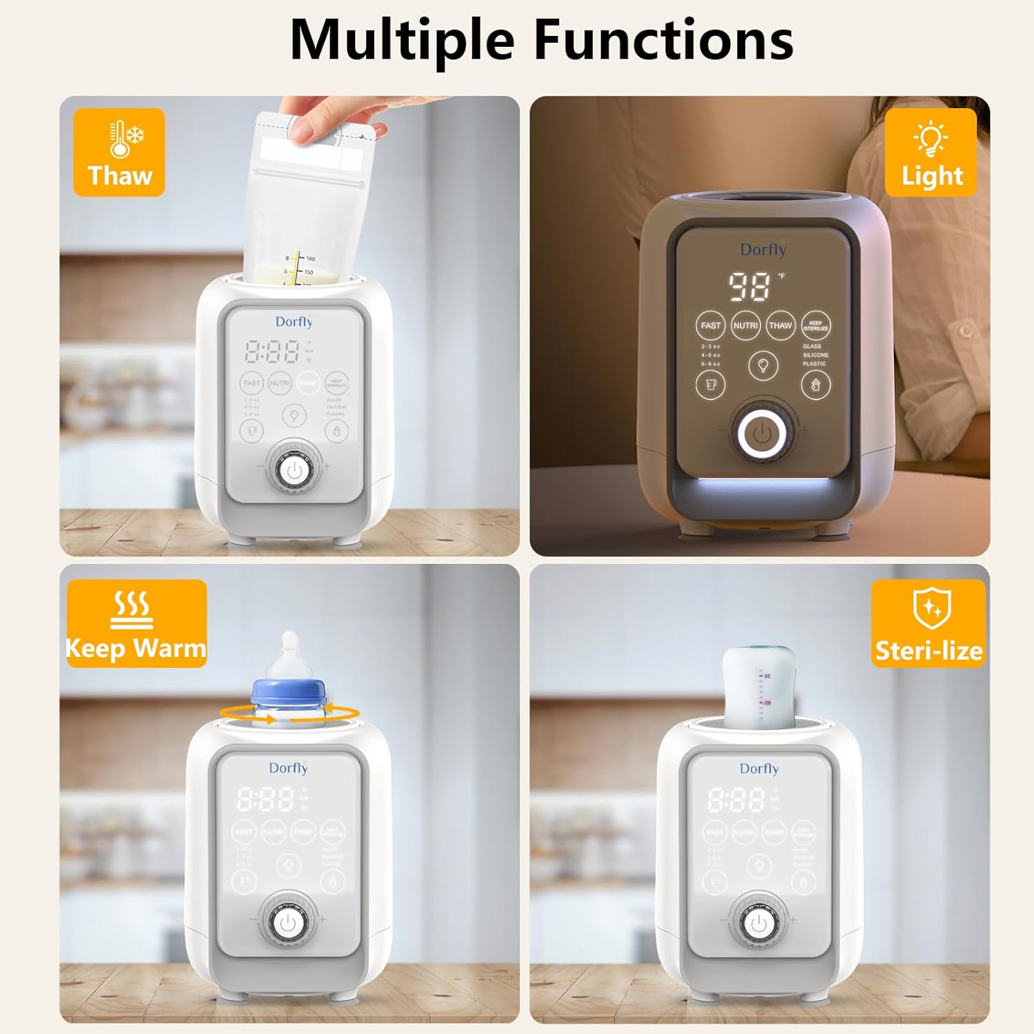 【9-in-1 Multifunction】: Dorfly milk warmer for baby does it all with 9 different functions: fast & nutri warming, gentle thawing, keeping warm, food heating, mixing formula, steaming, auto shut off, and an anti-scald basket.