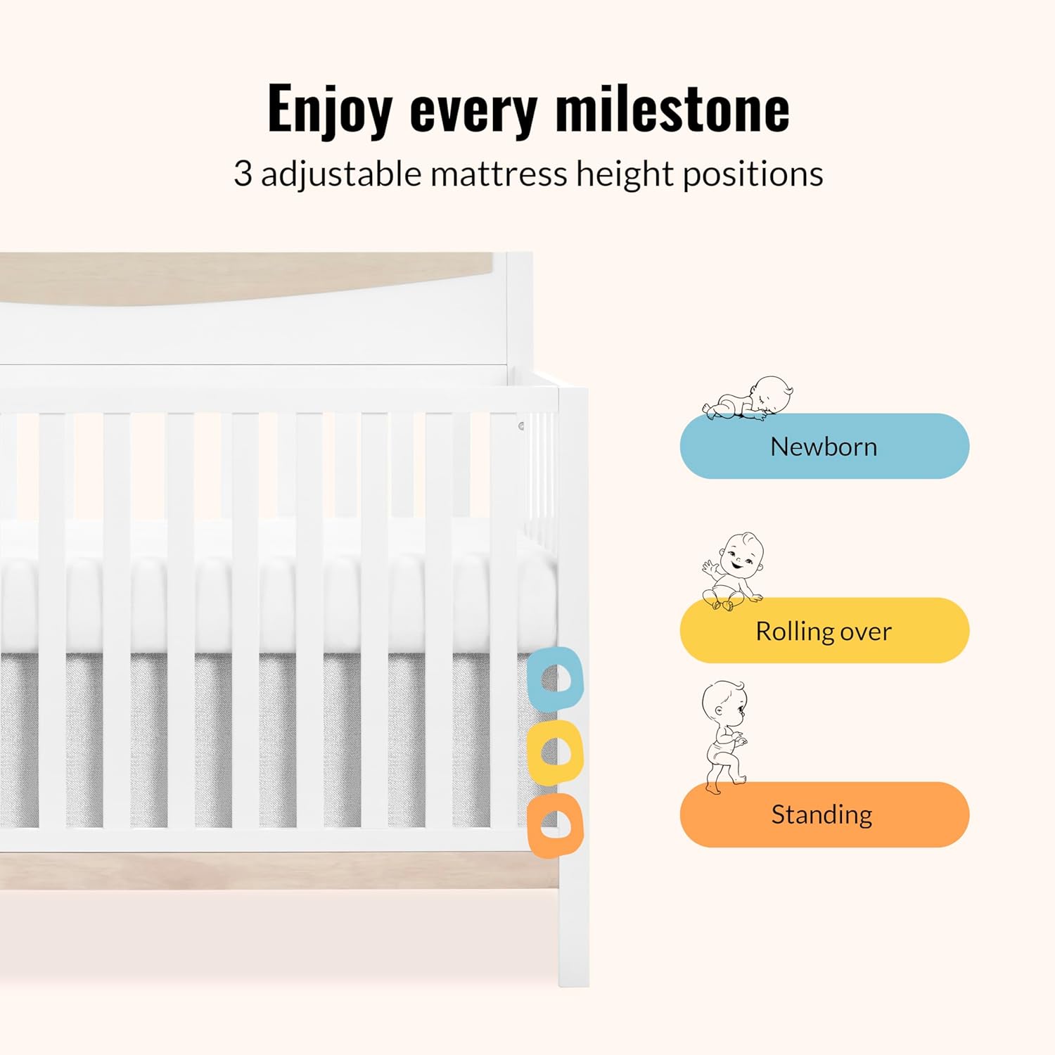 Adjustable Height For Comfort – Features three adjustable mattress height options that transition with your baby’s age and ability. This design offers maximum comfort and convenience, making it easier for parents to reach newborns and safer to contain active toddlers.