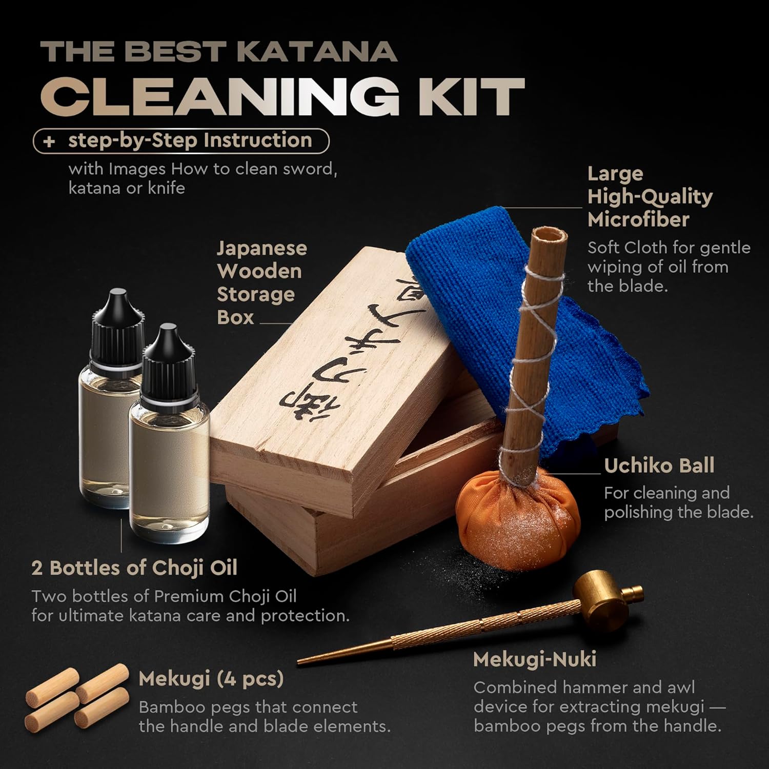 All-in-One Traditional Care Kit. Includes 2 bottles of choji oil, uchiko ball, brass hammer, cleaning cloth, 4 bamboo mekugi pegs, and a traditional japanese wooden storage box. Everything you need for proper japanese sword, katana or knife maintenance in one set.